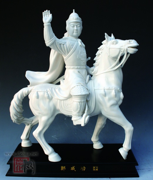 该作品长34cm,宽20cm,42cm。以戴盔、披甲、着袍、佩剑、骑马的威武、神圣的形象,充分显示统帅风度,从一个历史人物逐渐成长为中华民族遥遥相望的英雄。作品采用德化特有的优质高岭土结合高级工艺美术师广阔的思路,运用其独特的艺术手法刻画出一代圣人的神韵。荣获“第八届中国工艺美术博览会暨古典家具、收藏品博览会”“中艺杯”优秀作品评比金奖。