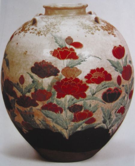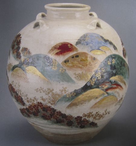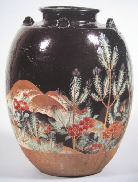 京都彩绘陶出现于江户时期,它的创始人是野野村仁清(约1596-1680年)。他原名清右卫门,青年时在京都、濑户学习制陶技术,定居京都后师从三文字屋九右卫门学彩绘,宽永年间(1624-1644年)先后在清水、栗田口、清闲寺、岩仓等地开窑制陶。约在1646年,仁清入仁和寺宫制陶,得到以茶风优美细腻著称的“公卿茶人”金森宗和(1584-1656年)的直接指导,所做陶器深受赏识,被赐予“仁”字,便自号“仁清”。1655年,仁清皈依佛门,潜心于制陶艺术,1656年(明历二年)创制了当时中国也没先例的彩绘陶器,是为京烧之始。仁清将当时京都贵族阶级所追求的华美灿烂的境界,毫无遗留地表现在彩绘陶器的造型与色彩之上,开创出初期京烧登峰造极的盛期。他兼收并蓄狩野派和土佐派绘画的精髓,从卷轴画、障壁画、扇面画中吸取金彩银彩的配色方法,运笔设色给人以无限的遐想。从之后的1660年代至80年代,仁清作出了许多优雅而又华丽的彩绘陶器,那些遗留至今的仁清彩绘陶器已成为世界各大博物馆的重量级藏品。