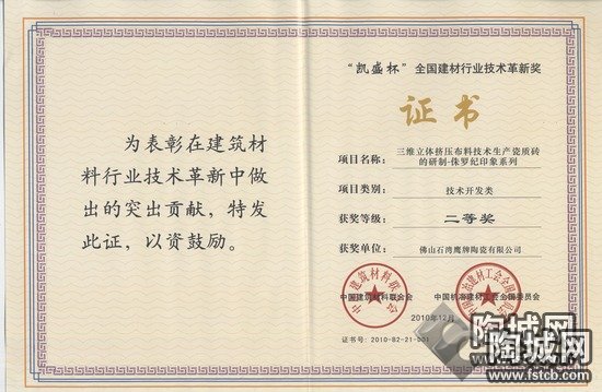 在此次颁奖大会上,由广东鹰牌陶瓷集团自主研发的“侏罗纪印象”系列产品凭借其独特的纹理结构、逼真的仿古木化石效果和创新的工艺技术特点,荣获了技术革新奖二等奖。