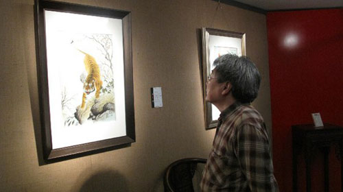 中国工艺美术大师熊钢如观看中国工艺美术大师吴锦华的作品《苍山红叶醉金秋》