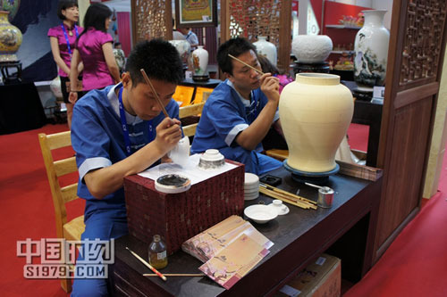 在第七届文博会非物质文化馆,景德镇陶瓷展示区不但有制作精湛的瓷器欣赏,还有工作人员进行现场表演。