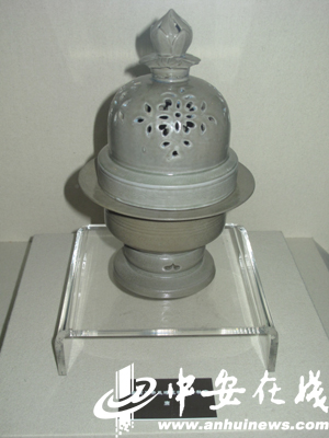产于唐代的越窑高足带盖暗花镂空青釉熏