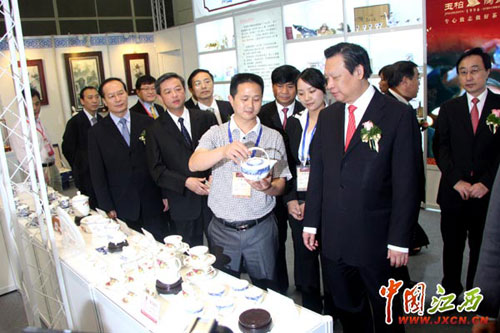5月18日上午,江西省长吴新雄与前来出席2011江西(香港)招商引资活动周的领导嘉宾一起为景德镇陶瓷香港展剪彩,并饶有兴致地巡馆参观。