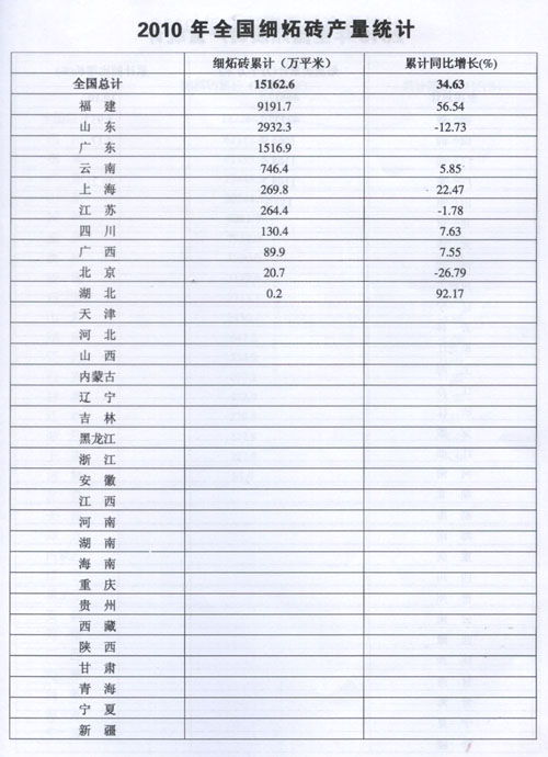 2010年全国细炻砖产量统计