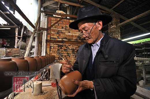 尽管之前并没有尝试过在陶坯上的刻画的经历,但老艺人颜义哲却当场就信心满满的应承下来。原来,颜义哲曾经是一名德化陶瓷厂的老员工,早在1956年,当年他还是一个刚满20岁的小伙子,就开始从事陶瓷彩绘工作,正是这30多年的彩绘工作经历,使他有信心在陶瓷坯上刻好画。