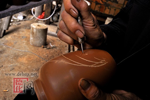颜义哲和台湾客商洽谈的生意,短期就交易结束,但他却从此喜欢上在陶坯上刻画的艺术,而且,这一坚持就是二十几年。如今,刻画技艺越来越娴熟的他,不用在陶坯上用笔勾画轮廓,就能将脑海中构思好的图案一气呵成地刻在陶坯上。