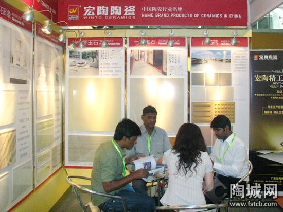 宏陶销售精英在热情为外国采购商介绍宏陶产品优势
