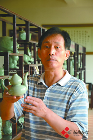 在叶国珍的办公室里,他抬头就能看见的地方,摆着一个他烧制的仿南宋官窑瓷盘。