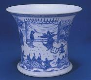 康熙青花使用的是极为纯净的云南珠明料,呈纯蓝色,浓淡层次多而分明,故称“康熙五彩”,此器就具有这一典型特点。高13.5cm,直口,筒腹,玉璧底。腹部主题纹饰为元代戏剧故事图,配以诗文。其绘画特点受中国画的影响,采用层层涂染的技巧,所绘人物用披麻皴法,线条纤细有力,生动自然。青花色调鲜丽,层次多而清晰,充分反映了这一时期青花的典型特征。