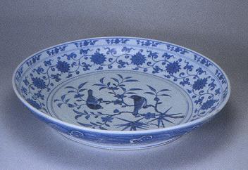 瓷盘径50.3cm,敞口略内敛,平底,圈足,外为白砂底。器内  沿绘一周折枝莲花纹,内壁为缠枝莲花,底饰雀桃  竹图案,外壁绘满海水波涛纹。绘画模仿宣德时期  的风格,但又有它独特的清秀典雅的特色,用笔趋  于纤柔,画面细腻富丽,构图严谨。青花色调浓艳  明快,有别于宣德时期的特征。