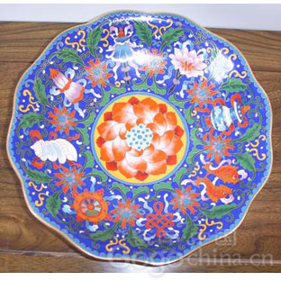 清代瓷盘常见有两种:一种是侈口、腹壁微弧,圈足较深,足尖圆滑,此种盘清早期腹较深、形体厚大。另一种是折腰撇沿,折腰线下部弧圆,上部斜直,圈足较浅,胎体相对薄小。清代装饰方法最为丰富多样。有斗彩、粉彩、五彩、素三彩,青花及单色釉等。内容多为龙凤、山水人物、花鸟鱼虫和有特殊寓意的吉祥图案。