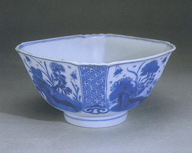 该方碗口径为14.8*14.4cm,侈口,方棱形口沿,腹呈方形,固足。腹部四面绘有表示祝福与象征吉祥的梅树、菊花、牡丹、荷花,衬以山石花草,四棱角处配饰几何锦地纹,下为如意云头纹,器内底方框内绘兰草花卉。绘画工整,题材丰富,画意深远。青花色调浅淡,造型独特,是康熙中期民窑青花的典型代表。