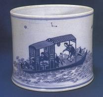 笔筒高16.3cm,口径185cm,直口,腹深壁直,平底浅挖足。胎质厚重,釉面光润。静静的江水中,一叶小舟顺流而下,船尾渔家夫妇摇橹行船,船中客人喝茶观景。笔筒另一侧有七言诗一首:“五百年来绕此游,水光依旧接天流,徘徊今夜东山月,仿佛当年壬戌秋,有客得鱼怡赤壁,无人载酒山黄州,吟成一啸干山寂,孤鹤横江掠小舟。”诗的下首落有“仿古”及“木石居”章,是件集艺术、实用为一体的代表作。