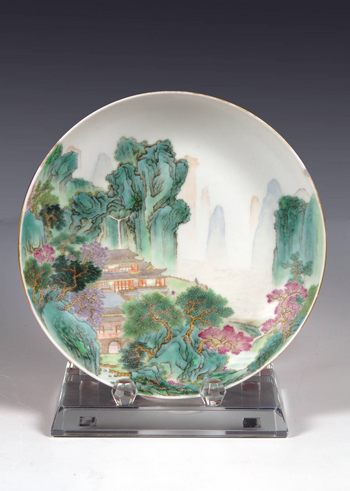 堂名款系指瓷器上书写或刻划私人住所或书房名称,作为私家用瓷或收藏标志的款识,内容包括堂名、斋名、轩名、室名、书房名、楼名,阁名等。堂名款最早出现于宋代,明代后期形成风尚,清代则更为流行,民国时期继续出现,但已不及清代丰富。民国堂名款具有以下几个特征:首先是一些达官贵人用瓷多有堂名,如袁世凯的“居仁堂制”、徐世昌的“静远堂制”、曹锟的“延庆楼制”等。这些瓷器均为当时名家所造,史载,1923年军阀曹锟曾出重金聘潘旬宇彩绘文具,但是否所有署“廷庆楼制”款识的皆为曹锟用瓷,或皆为潘氏所绘尚需考证。这部分堂名款均以印章形式出现在作品的底部。其次是文人雅士多有堂名,尤其是彩瓷名家, 如潘甸宇之“古欢”、王琦之“甸甸斋”、程意亭之“佩古斋”等。从严格意义上说,这类款识应称为艺人画室款识为妥。这部分款识见有印章形式,书写在器物的外底,亦有与书法款识相结合书在器物的外壁,而以后者居多。更为常见的是以书法形式的综合性堂名款识,如张志汤的“星江张志汤写于珠山亦陶斋西窗”。既有籍贯、姓名,也有斋名。由于这类款识已在人名款中加以介绍,故不再赘述。民国时期瓷器上署以堂名的器物较为多见,情况亦较为复杂,最为关键的是不能以款识中是否有“斋”、“轩”等字样便定性为堂名款。因民国时期瓷器生产厂商号之名亦多见“轩”、“堂”、“斋”等字样。貌似堂名,实则为商号,与主人的关系不大。如活跃于1920-1937年的彩瓷名家梁兑石,民国初年毕业于饶州窑业学堂,回南昌后开丽泽轩瓷店,请艺人按顾客要求绘制瓷器,由于忙于经营,无暇自己彩绘。当时的南昌名家刘希任作品多被丽泽轩购买,而邹文侯、万云岩均曾受聘于丽泽轩瓷店彩绘。