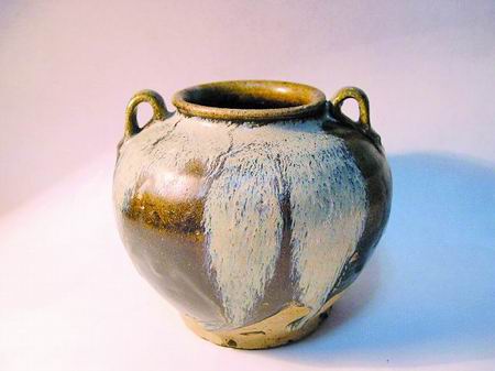 2004年夏在钧台窑附近出土了数件唐代器物,其中有一件唐花瓷双系罐堪称花釉瓷中的上品。此罐口径8.5厘米、高14厘米,唇口外翻,丰肩圆腹,平底无足,肩部饰双系,线条流畅,饱满圆润。整体施黑釉,从口部、双系点白斑至肩,白釉流动自然,白中见蓝,挥洒淋漓。黑釉深浅极富变化,深处浑厚如漆,浅处黑中泛黄,在白斑的衬托之下,明快亮丽、富丽堂皇,充满浪漫气息。