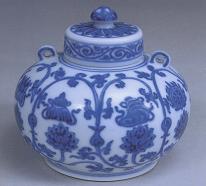 该罐通高9.7cm,胎质坚硬致密,釉泽莹润。直口,平底,颈两侧用环耳作装饰,不仅具有明永乐时期的造型特点,而且增添了秀  美之感。青花色泽艳丽,釉色光亮。器身绘莲花和佛教常用象征吉祥的轮、螺、伞、盖、花、罐、鱼、肠的八宝纹。