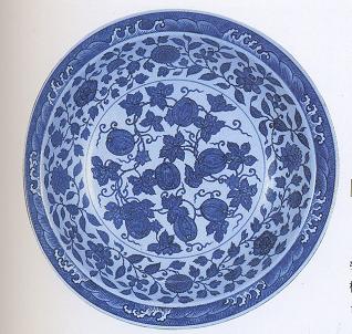 盘径45cm,折沿,弧腹,平底。沿面上绘起伏的海涛纹,严谨有序,一丝不苟。盘外壁用青花饰枇杷、石榴、樱桃、桂圆、荔枝等折枝花果,盘内腹饰有8朵盛开的菊花、牡丹、月季等缠枝花卉,平坦的盘心为中国传统的吉祥图案——“瓜绵图”,取世代绵长之意。