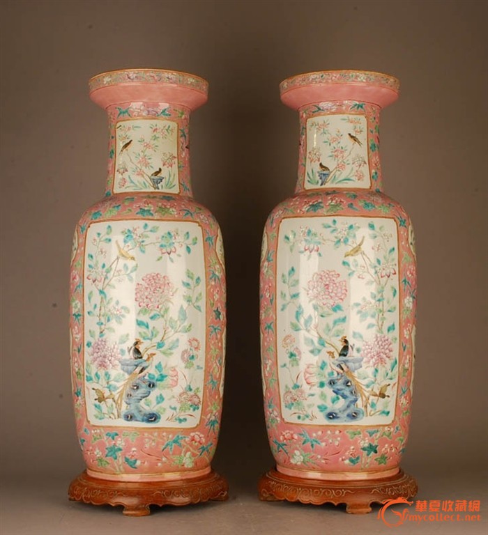 拍品介绍:高600MM,A:反口一处微磨彩,足圈浅磕,余完好。B:底有暗鸡爪纹。器型工整,色调素雅,精工细绘,镜像成对,原配老木座,非常难得。