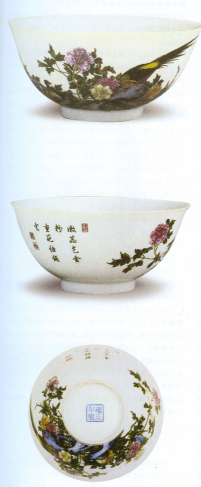 雍正珐琅彩瓷的胎与康熙时有所不同,不再使用“反瓷”,而是大量使用景德镇烧制的精细白瓷。这种白瓷胎体轻薄,胎质细密,在白度或透明度上都超过明永乐时期的甜白瓷。如一件松竹梅纹橄榄式瓶,胎体轻薄达到半脱胎状,迎光透视可见器壁上所绘松竹梅纹饰。雍正珐琅彩瓷在这种白瓷上绘画,使山之皴法,水之波纹,鸟之羽毛,甚至花叶边缘之芒,月季枝干之刺,都表现得更加细腻。如一件白地雉鸡牡丹纹碗,外壁绘花丛中雌、雄二雉鸡,栖于石上的雄雉鸡身绘各色鲜艳羽毛,若细分有十多种色彩,一翎一羽无不细致描绘,竭尽绚丽夺目之势。珐琅彩瓷发展到雍正时期,应该说达到了它的极盛期,它能将层峦叠嶂的整幅山水浓缩在小碗的内心,又可以将万紫千红的满园春色再现于一件小瓶的外壁。如一件蓝料彩山水纹碗,胎体洁白剔透,外壁蓝料彩绘通景山水画。画中崇山峻岭、苍松翠柏、仙台楼阁、茫茫沧海等景色栩栩如生。海天之上墨彩又题七言诗两句:“翠绕南山同一色,绿园沧海缘无边。”句首句尾分别钤“寿古”、“山高”、“水长”等印章。此碗在章法布局上融诗、书、画、印为一体,不仅绘画布局得当,笔意细腻流畅,而且诗中有画,画中有诗。