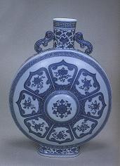 因瓶腹当中有凸出的圆月而得名。瓶高49.5cm,瓶腹遍体宽莲瓣纹,开光内分别绘有佛教常用象征吉祥的八件器物(或称佛八宝):轮、伞、盖、花、螺、鱼、肠、罐,间以回纹、缠枝灵芝为衬托,并用青花特意在瓶纹饰上点染一些深浅不同的细点,以仿明代宣德青花浓重、晕散的效果。瓶底中书“大清乾隆年制”青花篆书款。