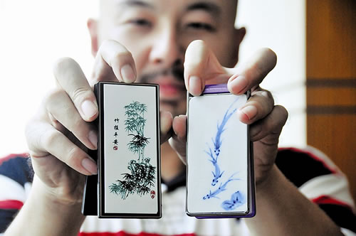 陶瓷手机由手机电子部件与陶瓷外壳结合而成,采用传统制瓷工艺和现代电子科技技术,经1300多度高温烧制而成,较好地展现了瓷文化。图为设计者马强在展示两款陶瓷手机。