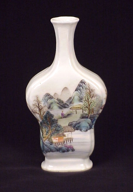 所谓洪宪瓷,即落有“洪宪年制”或“洪宪御制”款识的瓷器。北京艺术博物馆收藏有数件此类款识的瓷器,如一件粉彩人物纹瓶,口径10.1厘米,底径10.3厘米,高27.7厘米,腹围50厘米。造型为撇口,短颈,溜肩,长圆腹,圈足。口沿描金,口内施松石绿釉。器身通景绘粉彩山水人物纹,题名为“渊明爱菊”。底亦施松石绿釉,书红彩“洪宪年制”四字楷体双方框款,款识工整。