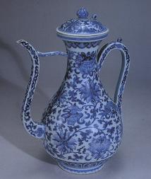 此壶是由玉壶春瓶演变而来的,故又称“玉壶春壶”。通高31cm,侈口,细颈,溜肩,垂腹,圈足外撇,颈至腹间设长流和曲把,形状秀美稳重。腹部主题纹饰为缠枝莲托八宝,上、下以莲瓣纹为陪衬,流饰折枝花卉,柄是卷草纹。青花色调蓝中闪灰,呈色稳定,具有乾隆朝的风格。绘画笔法纤细拘谨,画面显得呆板,是嘉庆时的特征。