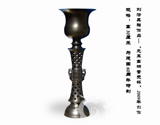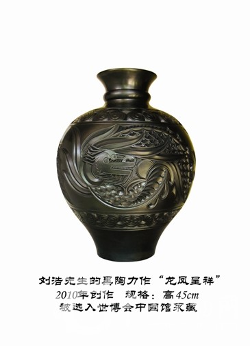 此次,刘浩先生同多名黑陶艺术家组团亮相2011山东陶瓷艺术博览会,展出的黑陶作品在继承传统的基础上大胆创新,变幻出新的结构形式,广泛的从不同的方位寻求了新的表现方式,有具象,有抽象,也有三度空间的立体造型。在百余件参展作品中,《龙耳高柄蛋壳杯》、《龙凤呈祥》等极具代表性的黑陶作品,凝聚着创造者独特的艺术构思,表现着各自的独特魅力,衬托着返璞归真的气质。在着力弘扬齐鲁文化的理念下,本次博览会展示现代黑陶艺术的高超技艺,给广大陶瓷爱好者提供了一场视觉盛宴。