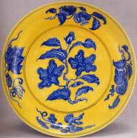明代黄釉青花器是在青花瓷器的纹饰之外用黄釉满填作底色,再经二次烧成。此品种从宣德传至嘉靖时期,弘治时的黄釉青花盘,其黄釉凝厚光亮,青花色调黑蓝,器型及纹饰与前朝基本相同。青花色调宣德、成化的色重,正德青花与弘治相似,但青花色泽仍显黑蓝。