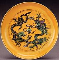 黄釉绿彩瓷以黄釉为地,用绿彩在雕刻好的暗龙纹等纹饰上彩绘,造型品种比较单一,图案纹饰多以龙纹为主,器型多以盘,碗为主。永乐,宣德时期彩龙纹凸起于釉面,弘治时期的外壁绿彩敷色薄而淡,呈色泛黄,嘉靖时期,不如前几朝精细,但器型品种纹饰内涵均丰富起来,且工艺繁琐,对清代黄釉绿彩器产生一定的影响。