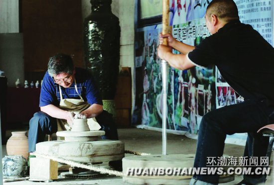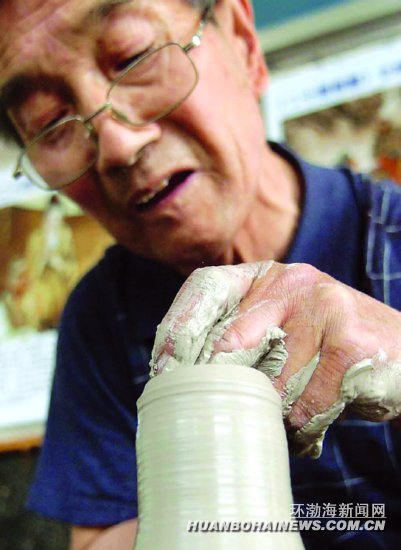 田景儒是田氏制陶第13代传人,精气神儿十足,根本不像75岁的老人。他自幼习学制陶,醉心陶艺,是唐山市手工制坯中堪称“全活”的少数老师傅之一。