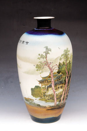 蔡玲玲,笔名玉人,江西省工艺美术大师,江西省高级工艺美术师,她的“山水”陶瓷作品展现了女艺术家特有的敏感和细腻。在表现主题上,蔡玲玲突破了传统陶瓷一贯的方式而追求现实表达,并能充分运用景德镇多种传统装饰技法来呈现自己对大自然的崇敬和女性特有的平和情怀。她大胆地利用陶瓷色釉在窑变中产生的特殊效果,使天空如彩虹、朝霞变化万千,有的更似万株礼花绽放苍穹。蓝或褐的色釉窑变则让大地呈现厚土的凝重肌理。古彩、粉彩、新彩的多种技法不但丰富了作品的色彩,更突现了画面的层次感。在她作品中,远山连绵起伏,近水碧波荡漾;几间古朴的农舍,数株苍劲的大树,河边小船静泊,山涧瀑布飞流;白云飘渺,炊烟缭绕;天空小鸟自由飞翔,水中群鸭逐波戏水;村姑或挎篮拾阶而上,或倚桥婉声歌唱。整个画面充满着春意盎然的田园风光,又使人宛如置身于宁静祥和的世外仙境。源于生活而高于生活,用景德镇特有的陶瓷文化资源让我们在城市喧闹的环境中品尝美妙的田园风光,陶醉在山水天地之间,这正是蔡玲玲山水作品的神韵之处。