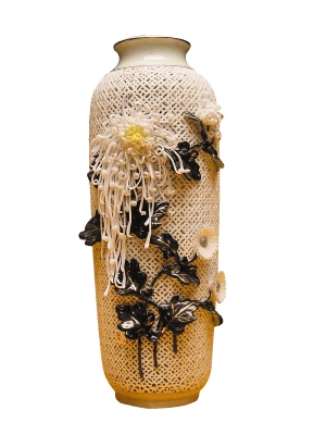“‘堆塑通雕’、‘贴花通雕’等都属于通花陶瓷类型,其吸收了潮汕其他民间工艺美术——例如木雕和石雕的携刻镂空手法,制成通雕花瓶或者花篮,再堆贴用装饰土制作的瓷花烧制而成。枫溪堆塑通雕花篮,以1979年制作的大型作品《春色长在大花篮》为代表作,现陈列于北京人民大会堂广东厅内。”