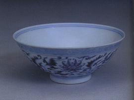 该碗口径9.8cm,造型规整,胎薄釉白。撇口,浅腹,腹下收敛,圈足。外壁口沿处绘忍冬纹,腹部为缠枝莲,碗心双圈内绘折枝花卉。纹饰清晰,制作精细。碗底有“大清道光年制”青花方形篆书款。