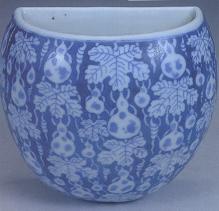 壁瓶因挂于壁面而得名。这件壁瓶高10.5cm,上面绘白色串枝葫芦纹,葫芦蔓叶相互缠绕,寓意‘‘子孙万代”。其制作手法是在胎上先刻好花纹轮廓线,在线外施青料,露出白色花纹,再罩一层透明釉,经高温烧制而成。
