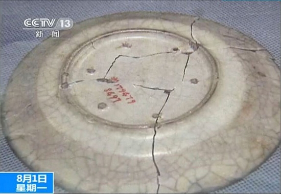 自前日故宫证实因人为操作失误损坏国家一级文物宋代哥窑的代表作品青釉葵瓣口盘后,昨日,央视《共同关注》节目中播放了其拍摄到的破碎文物图片。从图片中可以看到,文物破碎成了几片,情况较为严重。故宫方面在接受记者采访时表示,文物依然有希望修复。记者昨天从故宫相关工作人员处获悉,事故调查报告已于前天晚上完成,并在昨天上午交到了文化部和国家文物局。图为青釉葵瓣口盘背面图 央视截屏