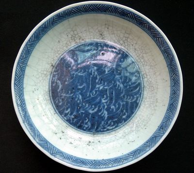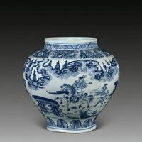 总的说来,此期器型主要还是瓶、罐、碗、杯、盘等几类。所用青料仍有部分是“苏青”。青花发色有的浓艳,与宣德器相近似,有的淡雅,与成化器较接近。釉面多泛灰。胎体较厚重。底足修削不细腻,有敦厚感;多见浅宽平砂底,有的有粘砂现象,有的见火石红。正统时的瓶、罐器口为直颈形,与宣德器一致;天顺时的则是象梯形的上窄下阔形,与成化时相近。瓶、罐的身体均是丰肩、圆腹、下收、足稍外撇;梅瓶的器身较宣德的修长。纹饰以一笔点划为主,有人物、花卉、龙凤、孔雀等。人物的背景多画大片云气纹。瓶、罐边饰喜画海水纹或蕉叶纹,其蕉叶中梗留白,叶面较宽大,像小树一般。款识正统的是福字款;景泰开始款识从器心移到器底,除福字外,还有“太平年造”、“太平”、“大明年造”等;天顺有纪年款、梵文款等。