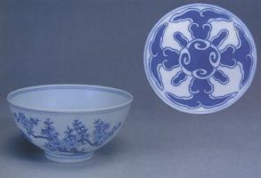 该碗口径13.2cm,圆形,圈足。胎质密,碗体施白釉,釉质细腻滋润。外壁为松、竹、梅组成的画面,既有独幅国画的观赏价值,又是整体装饰图案的一部分。造型凝重浑厚。
