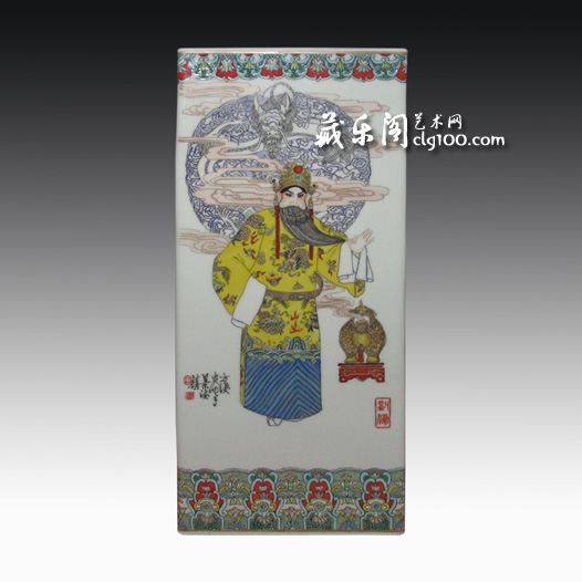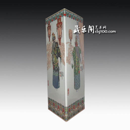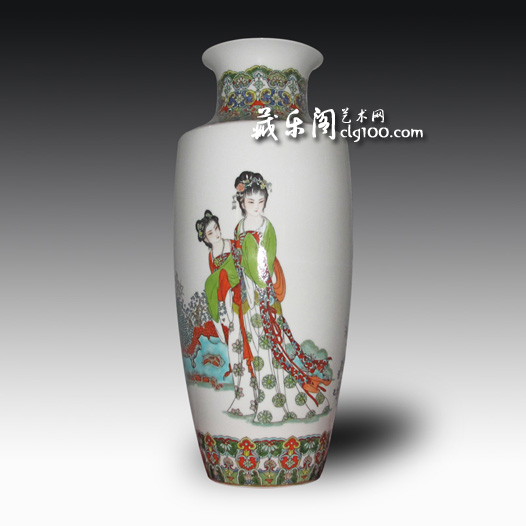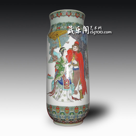 名家鉴赏:《西厢记》是我国家喻户晓的古典戏剧名著,它叙述了书生张君瑞和相国小姐崔莺莺邂逅相遇、一见钟情,经红娘的帮助下结合的爱情故事。方复老师熟悉历史典故和民间传说,把民间故事融入于瓷瓶中。他笔下的仕女,体态婀娜多姿,衣物纹饰色彩红绿分明,层次较少,彩色鲜明透彻。