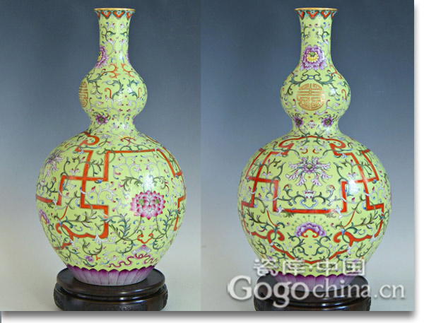 图:乾隆洋彩锦上添花万寿如意葫芦瓶高仿
