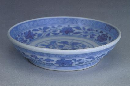 该盘径11.4cm,撇口,浅腹,平底,圈足。器内沿绘卷草,壁饰一周缠枝菊花,底为一束把莲,外沿绘回纹,腹饰缠枝莲一周。外底有无框“大清道光年制”青花篆书款。胎质洁白,施釉匀细,白中闪青。绘画较为精细,青花色调浓丽,有仿明代宣德青花的艺术效果。