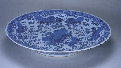 瓷盘径50.4cm,撇口,浅腹,平底,固足。内沿绘水浪纹,壁及底饰9只大小不一、形象各异的狮子纹,以绣球和火焰云为陪衬,形成一个狮子滚绣球  的壮观场面,外壁为缠枝莲。绘画规整,构图严谨,层次多而清晰。