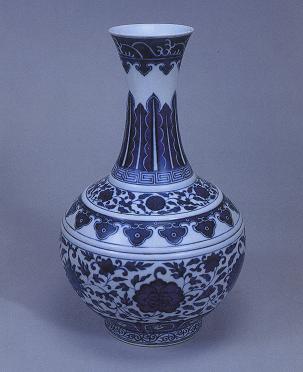 赏瓶除用于陈设观赏外,传闻还可作为君王对臣子的赏赐之用,故日赏瓶。赏瓶从雍正时期开始烧制,乾隆以后大量生产,并成为清廷中的传统器型,其基本造型为敞口,长颈,圆腹,圈足。用青花作装饰的赏瓶,肩部多数有凸起的弦纹装饰,题材以缠枝莲为主,蕉叶纹、回纹、卷草等为辅助纹饰。