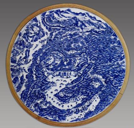 这是一幅用青花料绘制、以御窑厂为主题的景德镇图。中心所绘即“珠山御窑厂全貌”,仪门旃杆上高挂“上奉旨御窑厂”旗,清晰可见。街上的行人摩肩接踵,挑柴、担坯,你来我往,十分热闹。图的大部分为屋宇覆盖,烟囱林立,可见瓷都人烟稠密,多以陶为业,表现了十三里陶厂的繁华景象。
