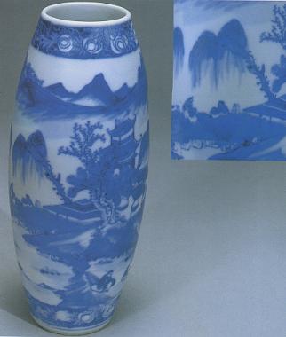 瓶高21cm,形状似橄榄,故名。瓶体绘秀丽而迷人的“水乡晨景图”,朦胧的远山,高耸的楼阁,弯曲的小桥,叶舟泛于水面之上,垂钓者静坐岸边,特别是以瓷器的底色表示湖水,更加开阔了画面的视野和寓意。