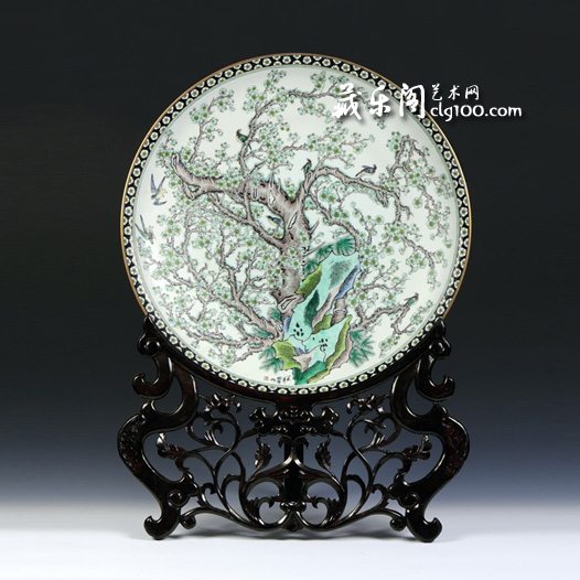 名家鉴赏:此彩盘采用了景德镇特有的古彩绘饰形式,刻画“衔霜当路发,映雪拟寒开”的冬梅。“梅林曲”图中,花儿或含苞欲放,或初绽花片;或盛开怒放,或残英点点,正侧偃仰,千姿百态,犹如万角斗珍珠撒布在玉盘上,与瓷质釉面相衬,晶莹透彻,渗出一股清气。梅树的筋纹,用笔顿挫变化,转折粗旷得势,发枝的笔势挺劲有力,行枝接续如弯弓秋月;短枝撇戳如箭,使梅树清刚的气格油然而生。梅的下部画有叠石,循守古彩画石旧例,用“钉头鼠尾描”勾画出石的层次质感,竖石在立面上以横线带,深化了“危亭势楫人,顽石默不语”的衬景匠心,笔简而醒题,色雅而溢韵,整个画幅古彩特色浓厚,布局,用笔,赋彩却别有新意,显见又脱出传统的巢臼,极具更深邃的思想内涵和与时俱进的“破茧化蝶”的创新思维。该作品曾获全国金奖。