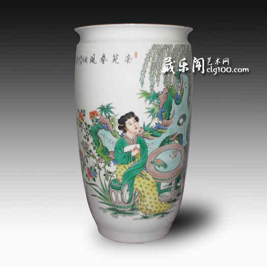 名家鉴赏:南苑,元、明、清三代皇家苑囿。此件作品运用古彩工艺,通过线条、填彩描写一幅悠闲自得画面,作品色彩艳丽,布局疏密有度,仕女神态怡然自得,线条刚劲有力。整体画面和器型合理搭配,一幅春风得意图跃然于眼。