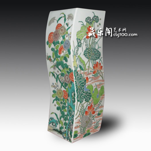 名家鉴赏:此件花鸟镶器作品出自中国陶瓷艺术大师蓝国华。古彩又称“康熙五彩”,是富贵显赫的景德镇官窑瓷中的珍品,工艺难度非常大,号称瓷中“国粹”。此件作品以他本人比较擅长的花鸟为主,造型独特,富有节奏美感,四面绘有不同的花鸟图案,线条刚劲有力,填彩艳丽,是一件重工重彩同时又很完美的作品。