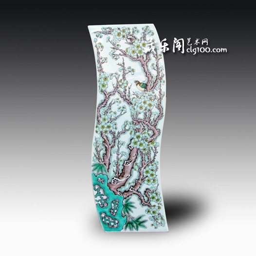 他的古彩作品多以花鸟为题材,尤擅画梅,所作既有浓郁“冰花个个圆如玉,羌笛吹它不下来”的古彩线描要素,又为古彩在器皿上施画增加了装饰性和意韵美。其笔下的梅花,或临岸倚岩,树虬花疏,含苞半开;或沐风洗雨,枝闲花茂,离披烂漫;或披烟带雾,娇嫩盈枝;或临雪照月,低回偃折,把梅花高格逸韵诠释得时空交融,令人心旷神怡。