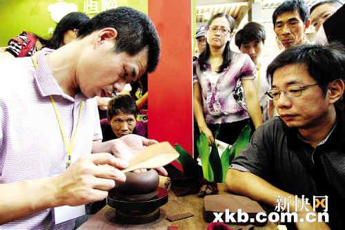 一个小转盘、牛角片、一把小刀、一块灰红色的紫砂泥,在大师的手中,经过揉搓、拍打、剪切、粘贴等一系列灵活的动作后,只用了30分钟,一把精美的紫砂壶成形。昨日上午10时30分,为期3日的第二届广州紫砂陶瓷艺术文化节在广州锦汉展览中心开幕,工艺大师现场制作紫砂壶的场面让观众叹为观止。现场制作好的紫砂壶还要通过温度达1100-1180℃的电炉烧制,才能最后完成。
